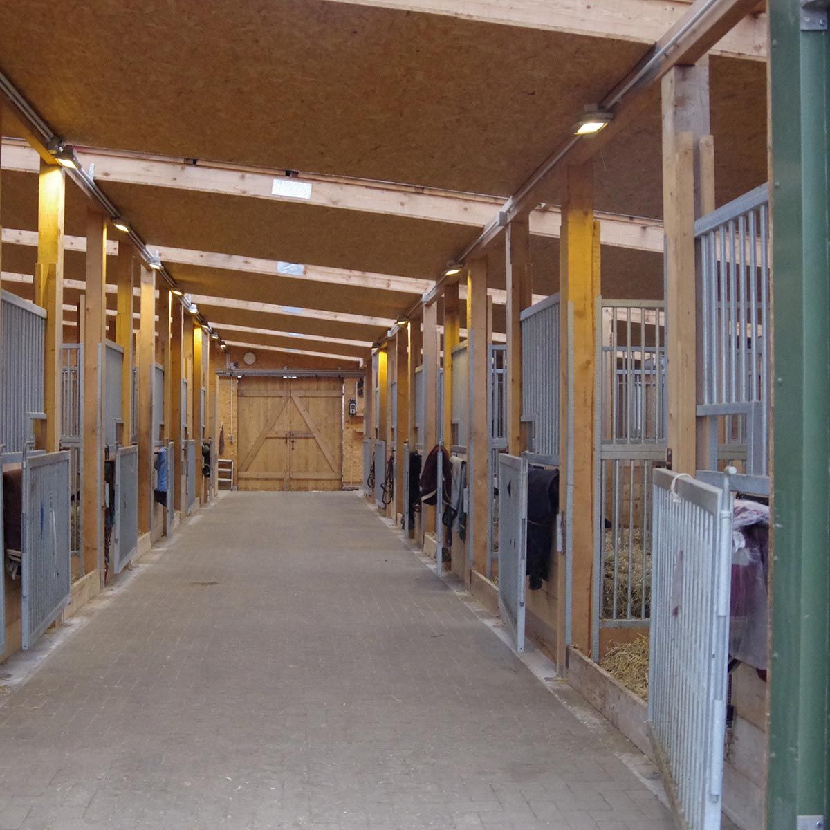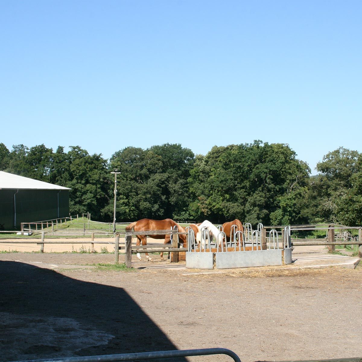 Im „ Neuen Stall“, 2017 erstellt, werden die Pferde jeden auf ihre befestigten Paddocks mit Weide geführt. Auf dieser Paddock- / Weidefläche stehen die Pferde immer zu zweit mit eigener frostsicherer Wasserversorgung und Raufe.