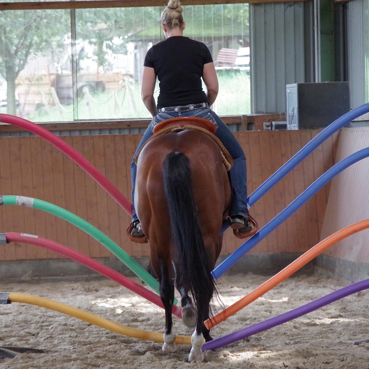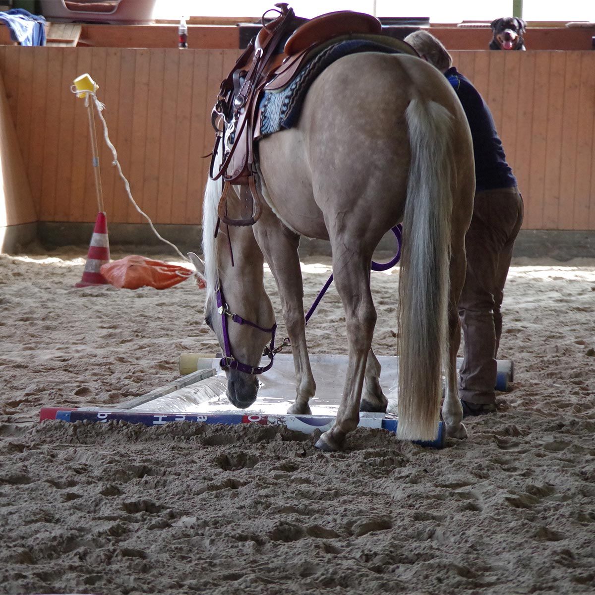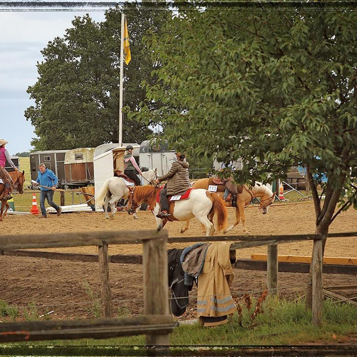 Unser 2018 erweiterte und neu gestalteter Außenreit und Trailplatz hat ein Reitmaß von 25 x 50m und hat sich als solcher bei der Landesmeisterschaft der EWU HH/SH und Mecklenburg Vorpommer im August schon super bewährt. Aufgrund seines Aufbaus (Fließ und Sand/Späne) ist er aber weder zum Longieren noch für Reining Manöver geeignet.